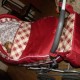 Цвет бордовый. Люлька отсоединяется (боковые ремешки убираются в карманчики на молнии) и её можно использовать как переноску. К коляске в комплекте прилагается: сумка (пристёгивается к ручке), чехол и дождевик. Угол наклона ручки регулируется.